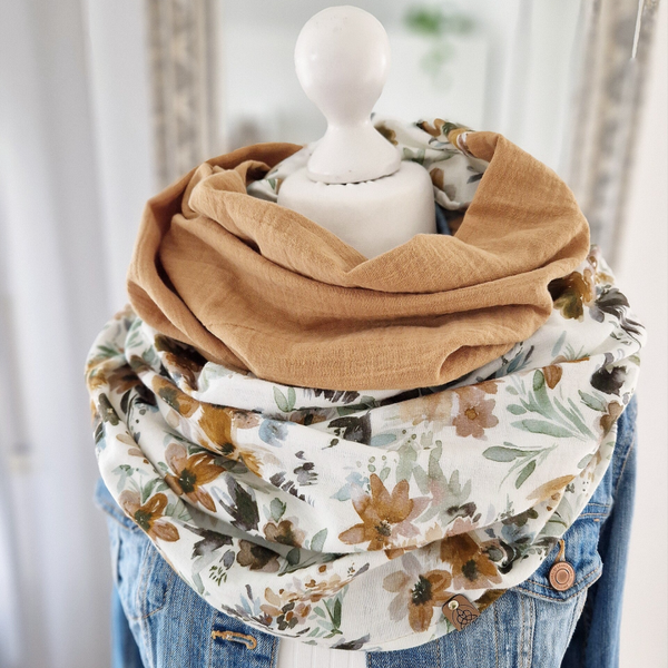 Loop Musselin zweifarbig - aquarell Flowers | karamell
