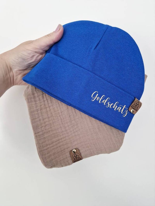 Beanie Set royalblau | beige "Goldschatz" gold Kopfumfang 42/44cm