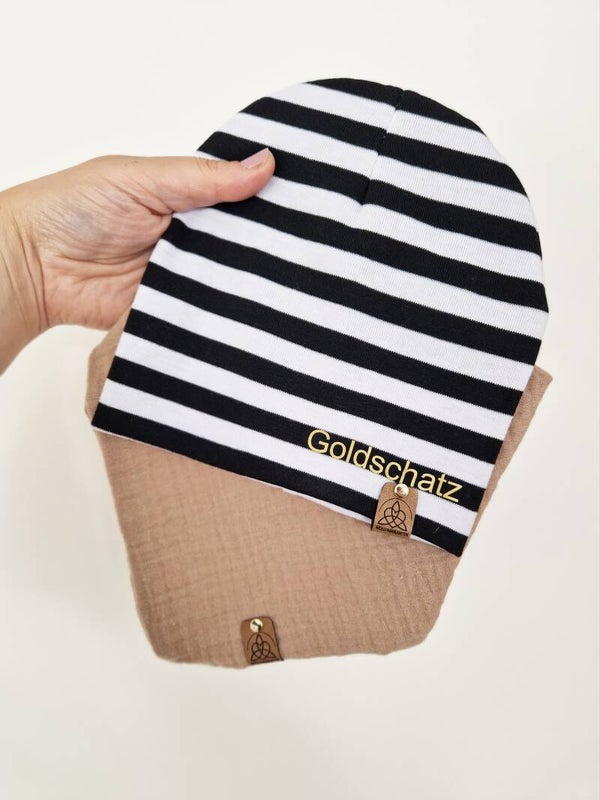 Beanie Set Streifen | beige "Goldschatz" gold Kopfumfang 42/44cm